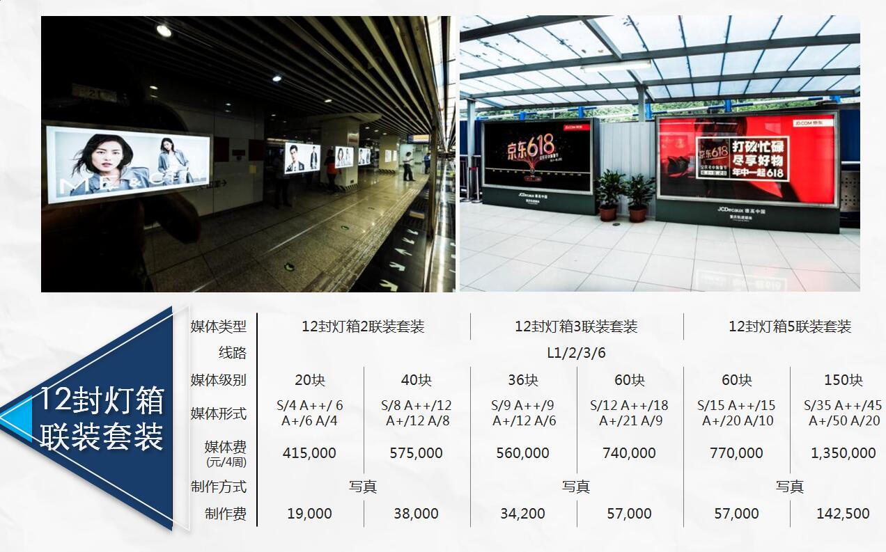 媒體類型: ?重慶地鐵梯牌套裝 套裝1:L1 ? ? ? ? ?媒體分布:全線覆蓋套裝 媒體費用:460,000 套裝2:L3 ? ? ? ? ? 媒體分布:全線覆蓋套裝 媒體費:540,000 套裝3:L6 ? ? ? ? ? 媒體分布:全線覆蓋套裝 媒體費:400,000 制作費:40元/塊 |