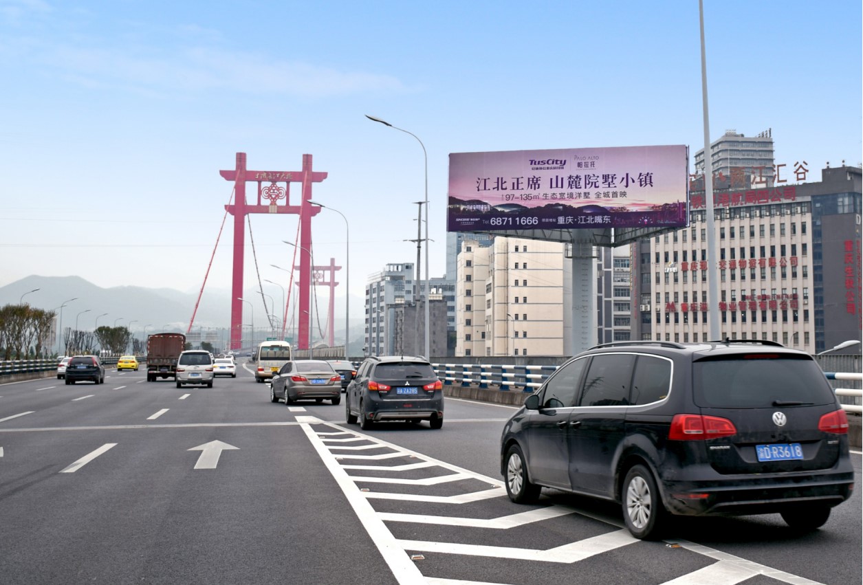 媒體位于立交西上道口同時能有效輻射立交西出口的所有車輛,距離重慶機場7公里路程,主要承擔江北,渝北到T3機場以及出城東向的車流,進出群體多元,車流量大,輻射范圍廣。該區域無競爭媒體,廣告發布形式單一,視覺沖擊力強,有利于廣告信息的傳播,是企業提高知名度的理想媒體