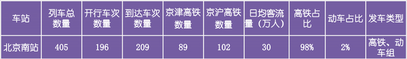 北京南站高鐵數(shù)量占比98%,動車數(shù)量占比2%。通過對比顯示,北京南站發(fā)送列車主要以高鐵列車為主,包含京津城際、京滬線、部分京哈線。