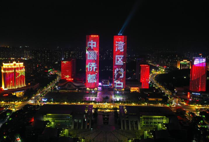 城市地標(biāo)燈光秀廣告,廣東江門蓬江萬達(dá)雙子塔樓體燈光秀廣告