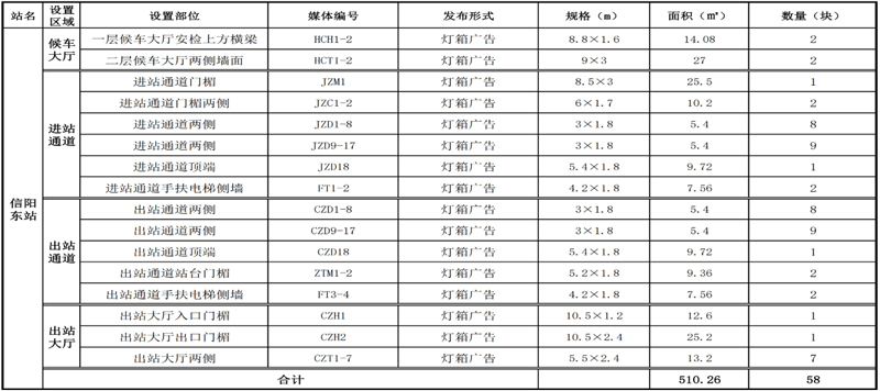 京廣高速鐵路重要組成部分,將信陽融入到鄭州和武漢1小時都市圈輻射范圍;信陽東站內共有燈箱媒體58塊,媒體面積510.26㎡。