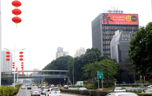 該廣告牌位于濱河路與皇崗路交匯處外運大廈西面墻體,濱河路是深圳車流密度最大的主干道之一,而皇崗路是連接市中心的交通要道,因此廣告牌垂直于路面,大氣美觀,處于十分顯眼的位置,可視距離非常遠,視覺效果十分突出,該廣告牌能覆蓋了羅湖,福田,南山往來的車輛及人群,受眾廣泛且層次高。