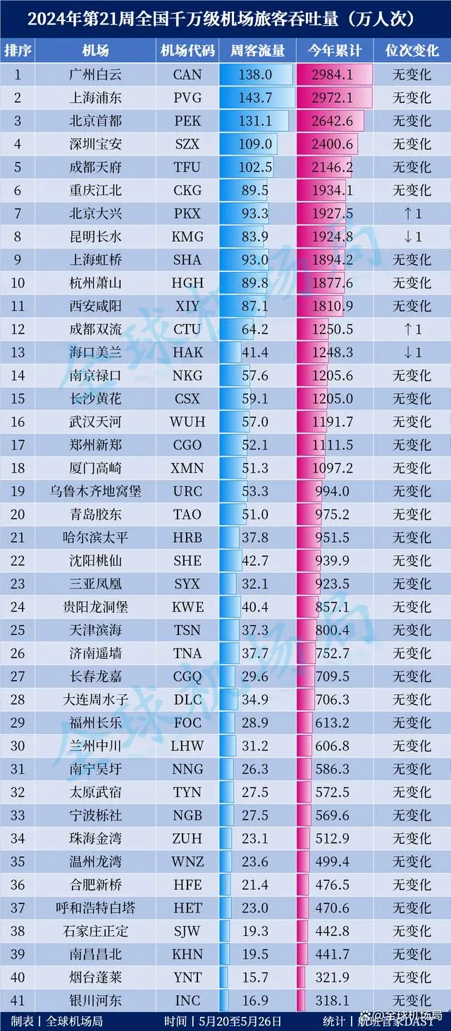 2024年第21周全國(guó)千萬(wàn)級(jí)機(jī)場(chǎng)客流出爐!